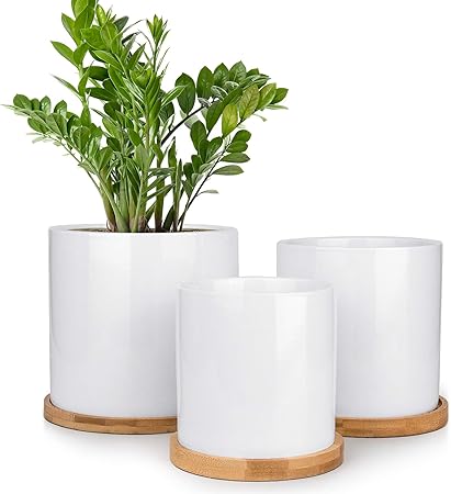 Homenote Ceramic Planters White Indoor Plant Pots Set Of 3 Round Cylinder Tall Garden Pots With Drainage Bamboo Trays For Plants Flowers Succulents